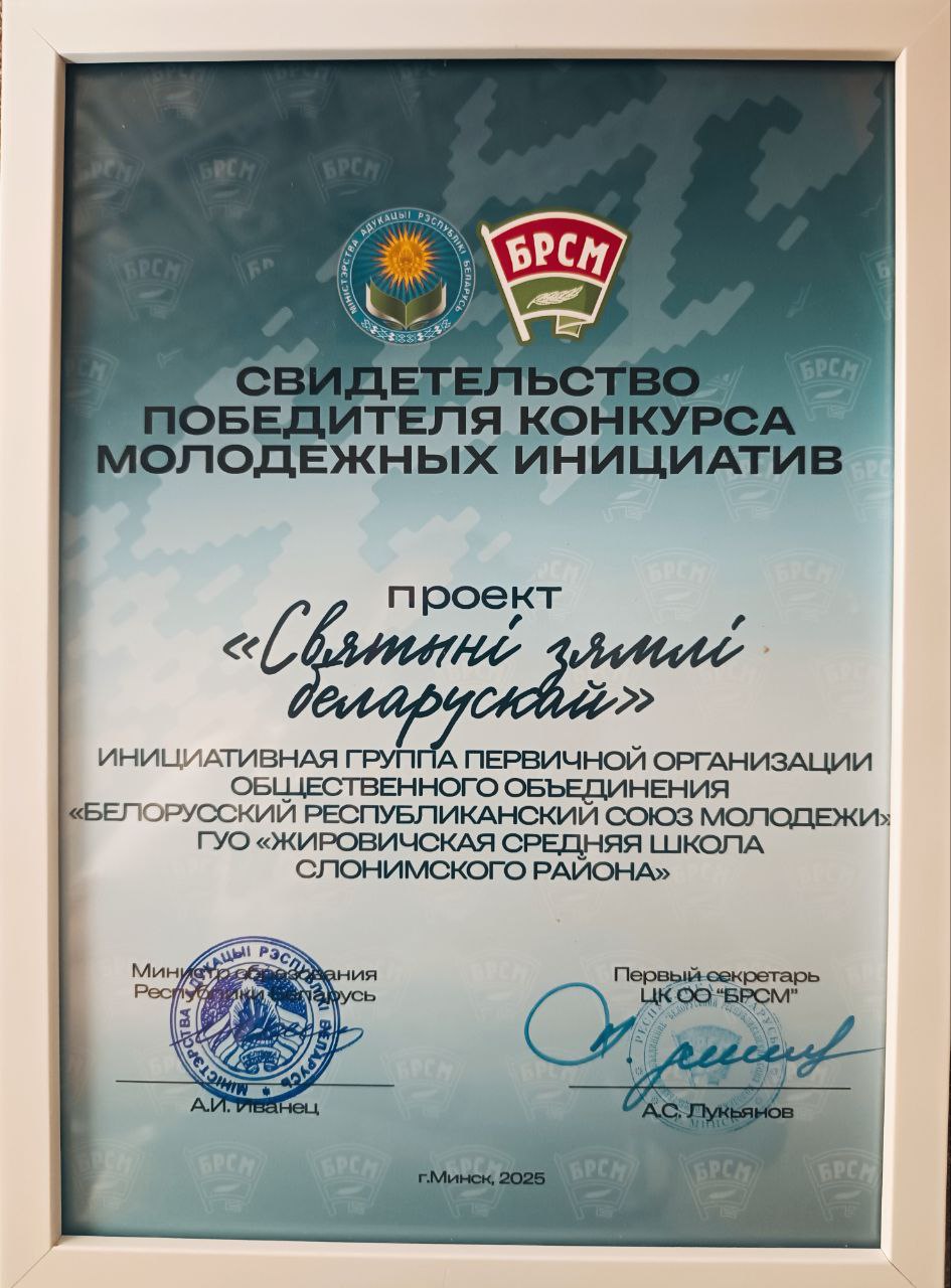 В четвертом сезоне в адрес комиссии по отбору заявок участников конкурса молодежных инициатив в ноябре 2024 года поступило более 200 заявок, из них 129 прошли первичный отбор. Госфинансирование получили 24 победителя конкурса. Радует, что в числе победителей наш проект «Святыни земли белорусской». Сегодня Ольге Владимировне Кулине вручили свидетельство победителя конкурса молодежных инициатив.