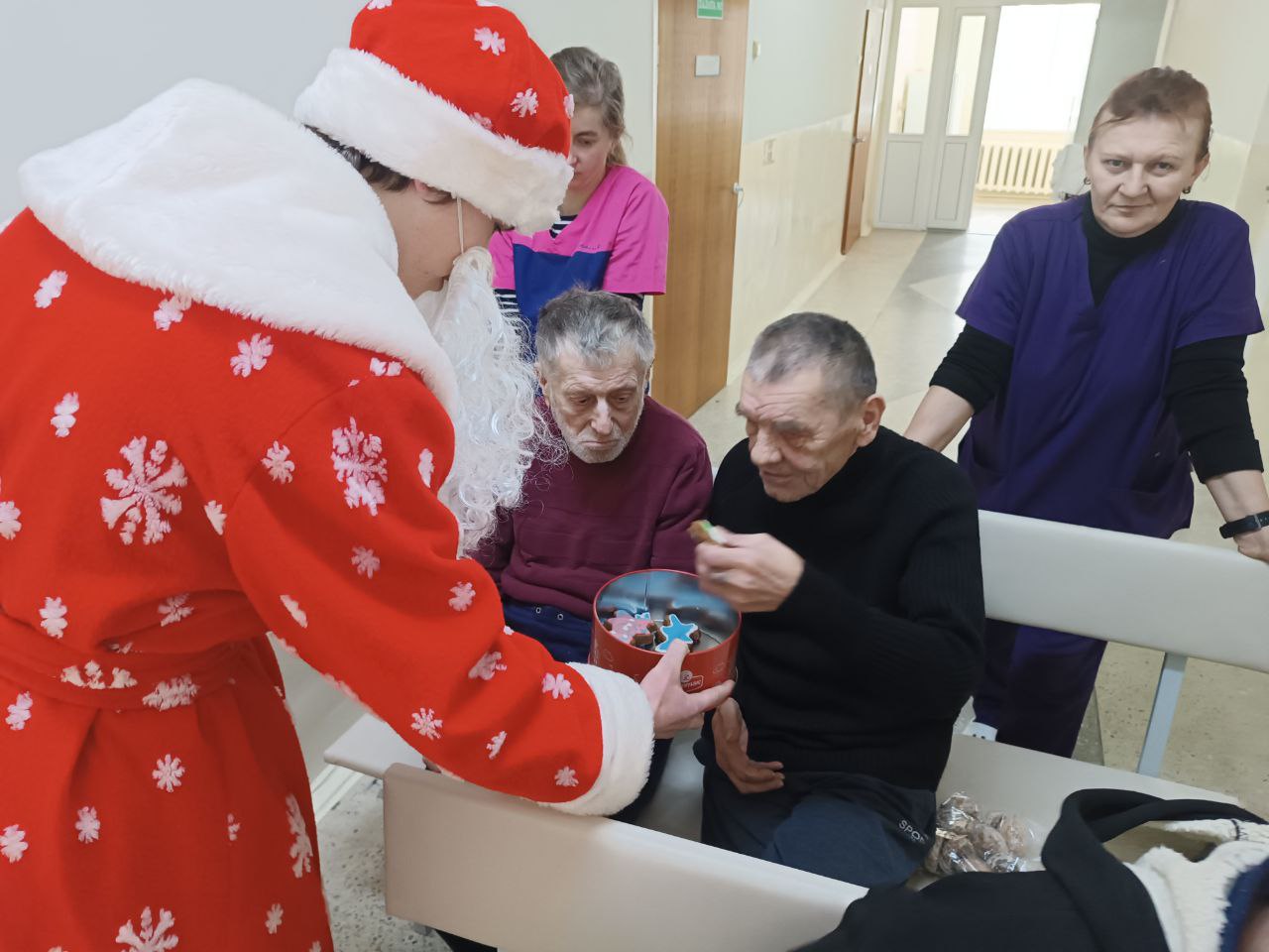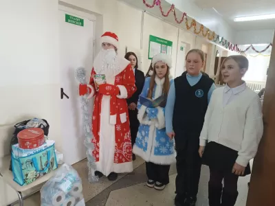 Ребята собрали и передали моющие и гигиенические средства для нужд больницы, а также подготовили небольшие подарки и сладкие угощения для пациентов. Не обошлось без поздравлений и от Деда Мороза и Снегурочки, которые обратились ко всем присутствующим с тёплыми пожеланиями здоровья и скорейшего выздоровления.