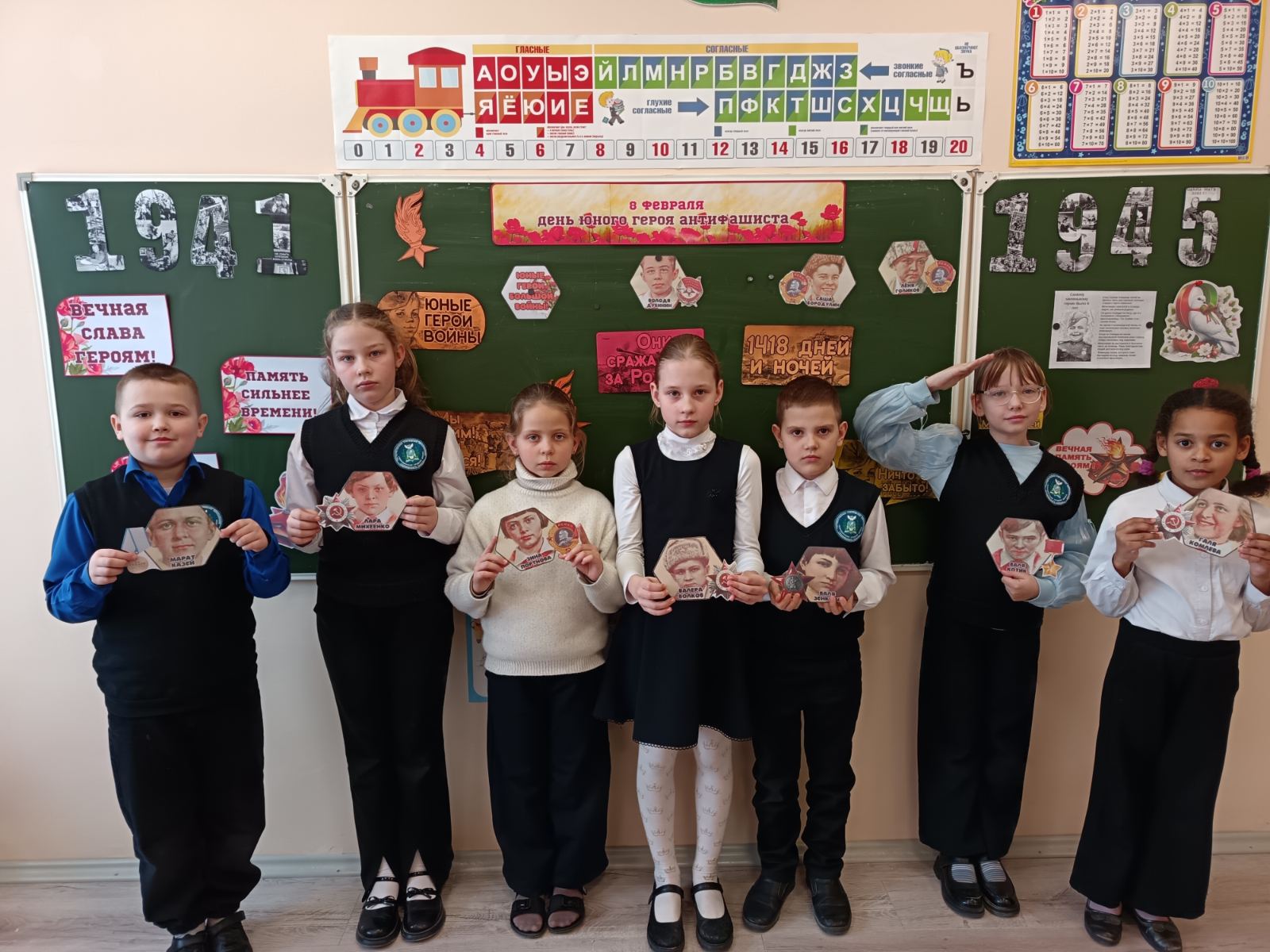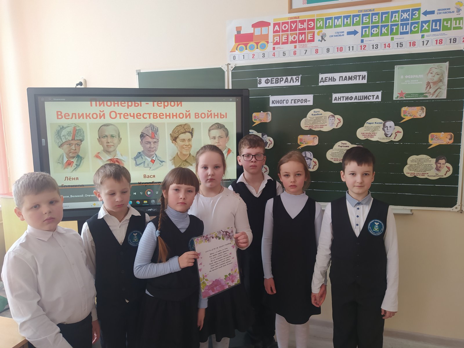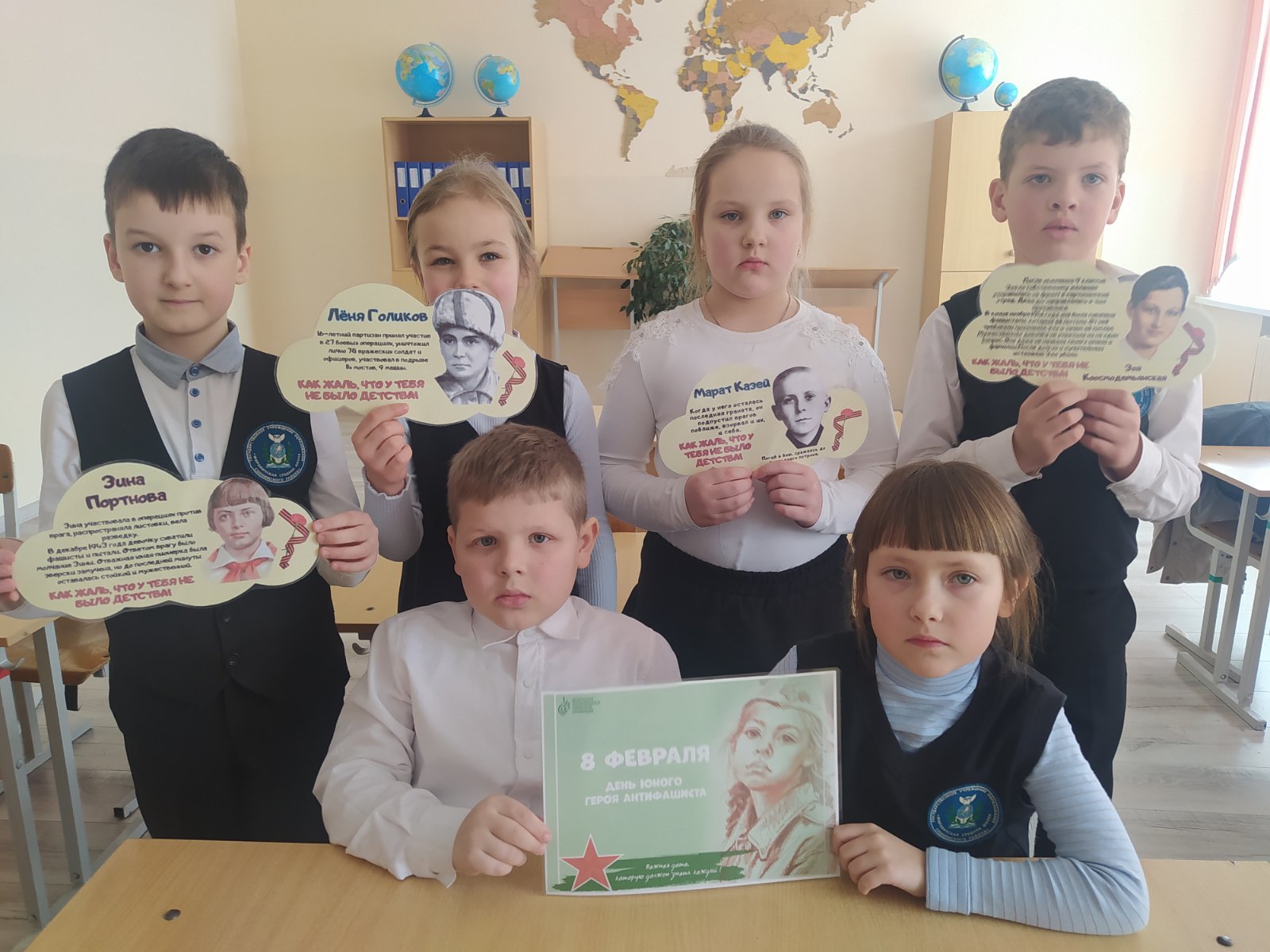 Мероприятие началось с яркого рассказа о знаменитых юных героях: Вале Котике, Марате Казею, Зине Портновой и других. Дети узнали, как эти смелые ребята становились разведчиками, связными и даже партизанами, рискуя жизнью ради победы. Чтобы сделать урок живым и запоминающимся, классные комнаты были украшены плакатами с портретами героев, фотографиями из военного времени и символикой антифашистского движения.