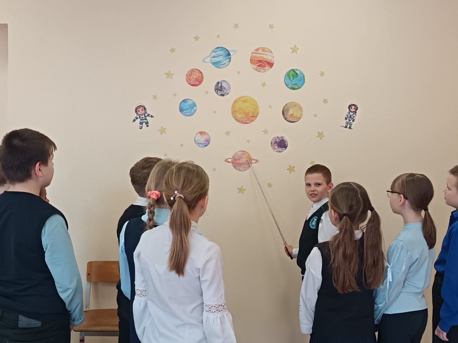 В ходе беседы дети активно отвечали на вопросы викторины, делились своими знаниями о планетах Солнечной системы и современных космических достижениях. Особый интерес у школьников вызвало обсуждение того, какими качествами должен обладать космонавт и какие земные профессии помогают изучать звёзды.