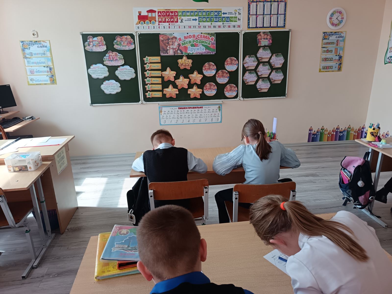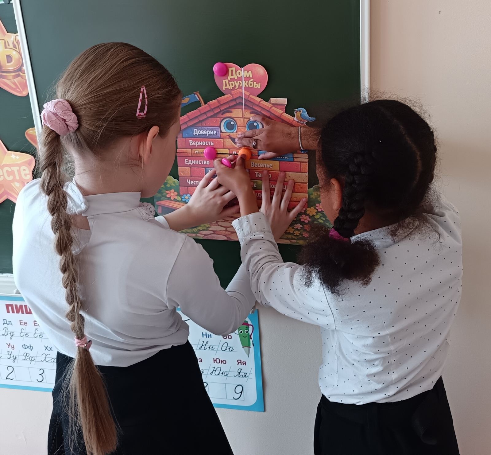 В интерактивной части занятия третьеклассники выполняли задания на сплочение: составляли «Кодекс дружбы», разгадывали ребусы о дружеских качествах и собирали пословицы. Особый отклик вызвало упражнение «Дом дружбы», где каждый кирпичик символизировал одно из правил – от честности до умения прощать.